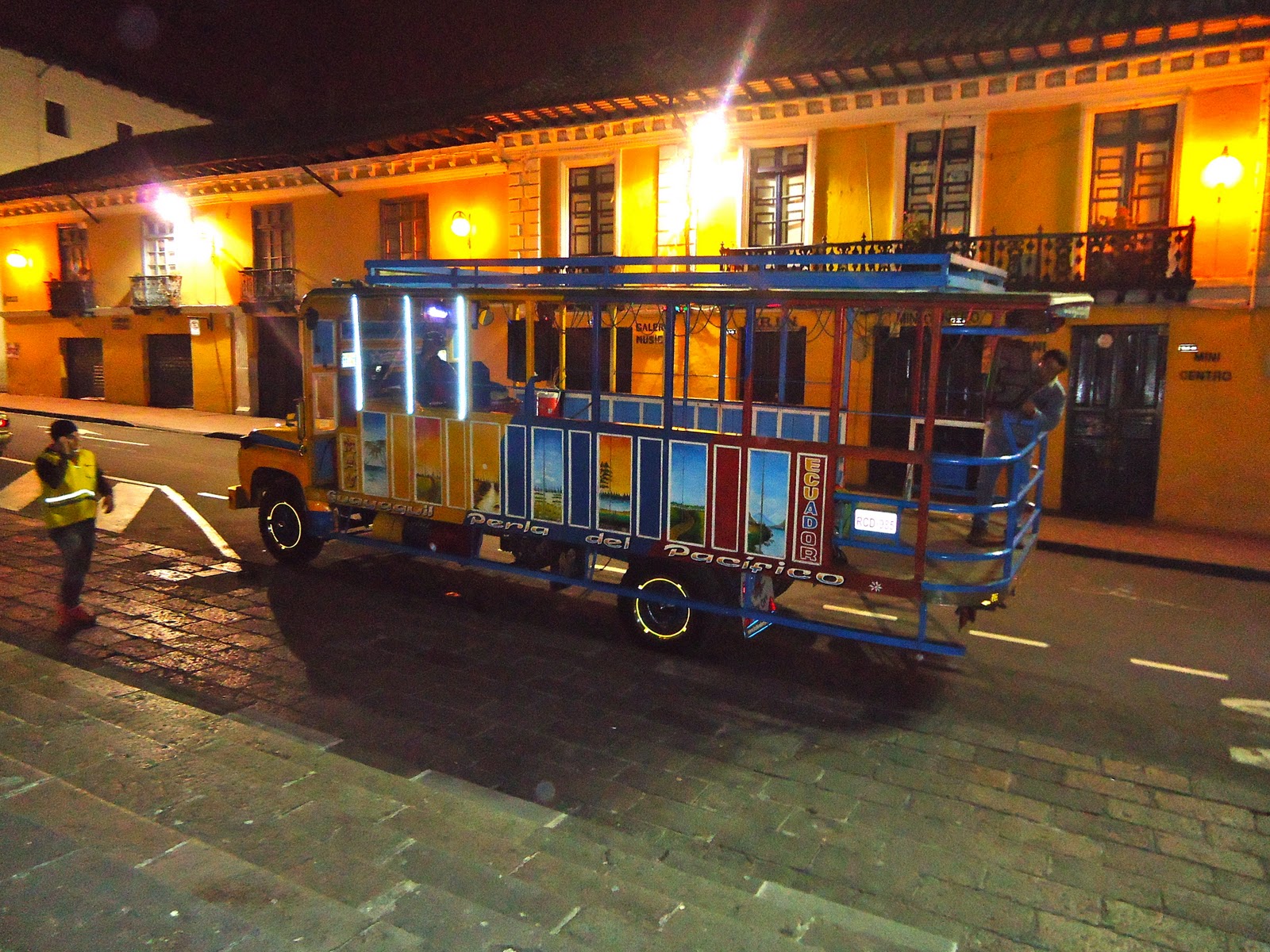 Quito days have begun here! Next monday is 6 de diciembre which is Quitos independence day and the week leading up to it is called Quito Days which just means there are tons of parties and cool events all week. On Monday night, our abroad program rented us a Chiva. A Chiva is a big open air bus with ropes on the ceiling to hold onto and a DJ on board. They gave us all plastic cubs to wear around out necks on a string and had jugs of canelazo (warm alcoholic fruity cider) to drink. We drove around the entire city for two hours blasting music and dancing on the bus. It was tons of fun!